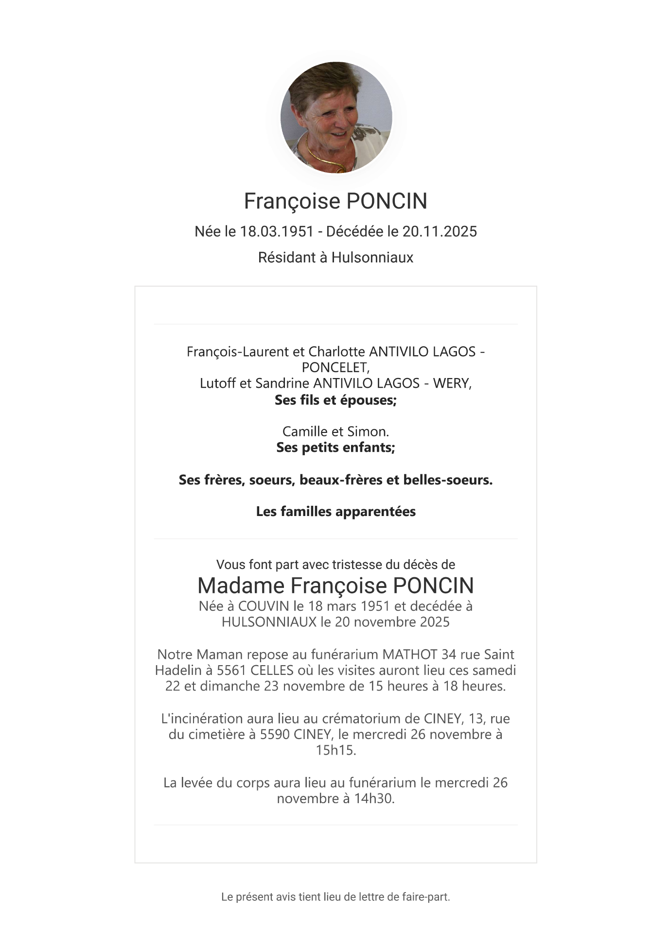 Décédée à Hulsonniaux (5560) le jeudi 20 novembre 2025 à l'âge de 74 ans