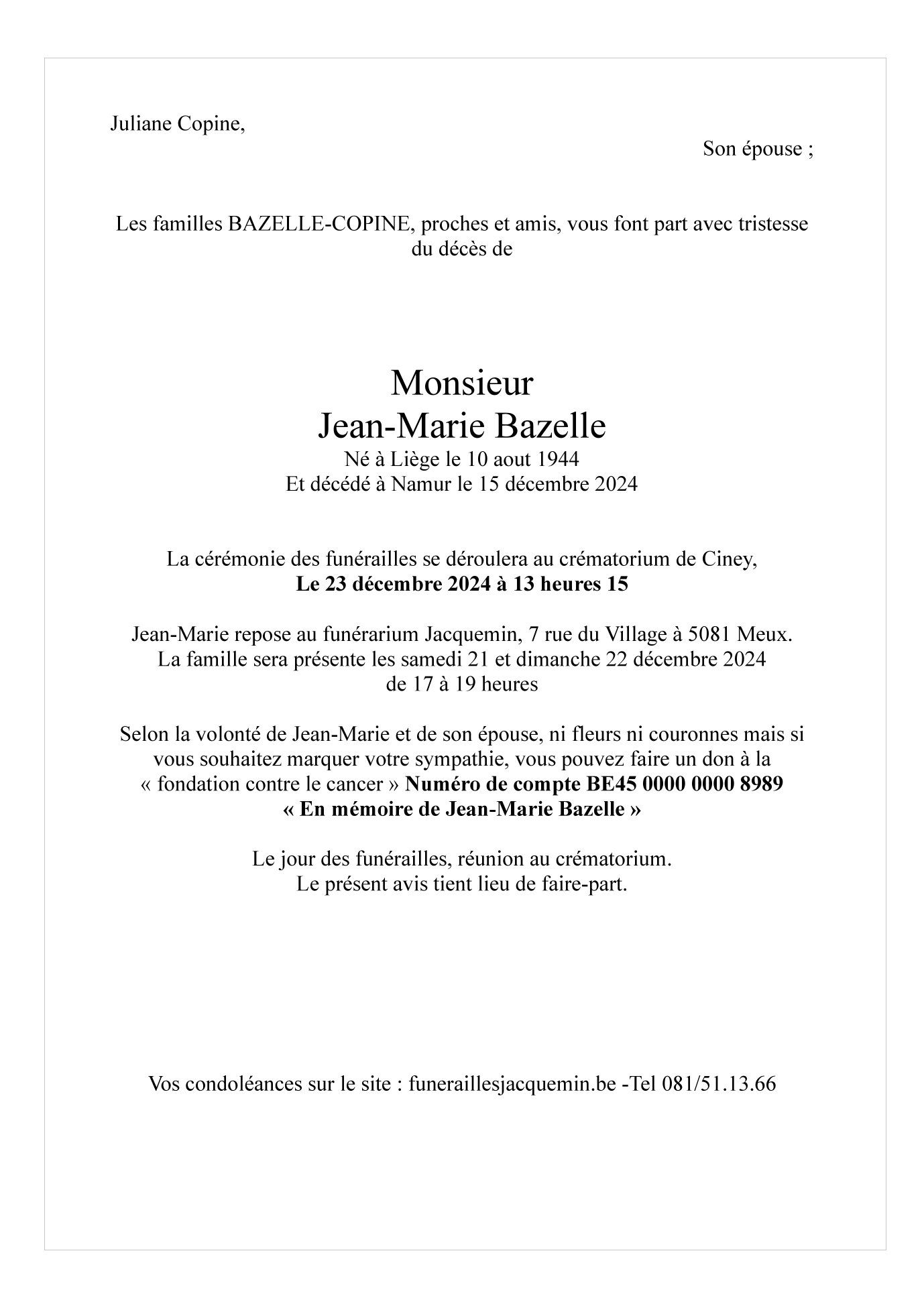 Décédé à Salzinnes (5000) le dimanche 15 décembre 2024 à l'âge de 80 ans