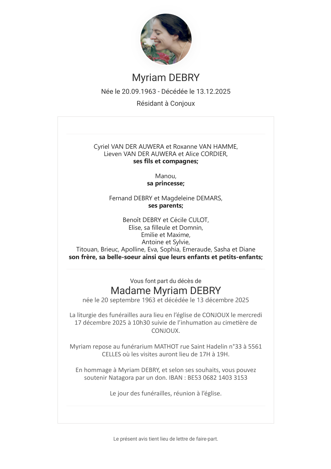 Décédée à Conjoux (5590) le samedi 13 décembre 2025 à l'âge de 62 ans
